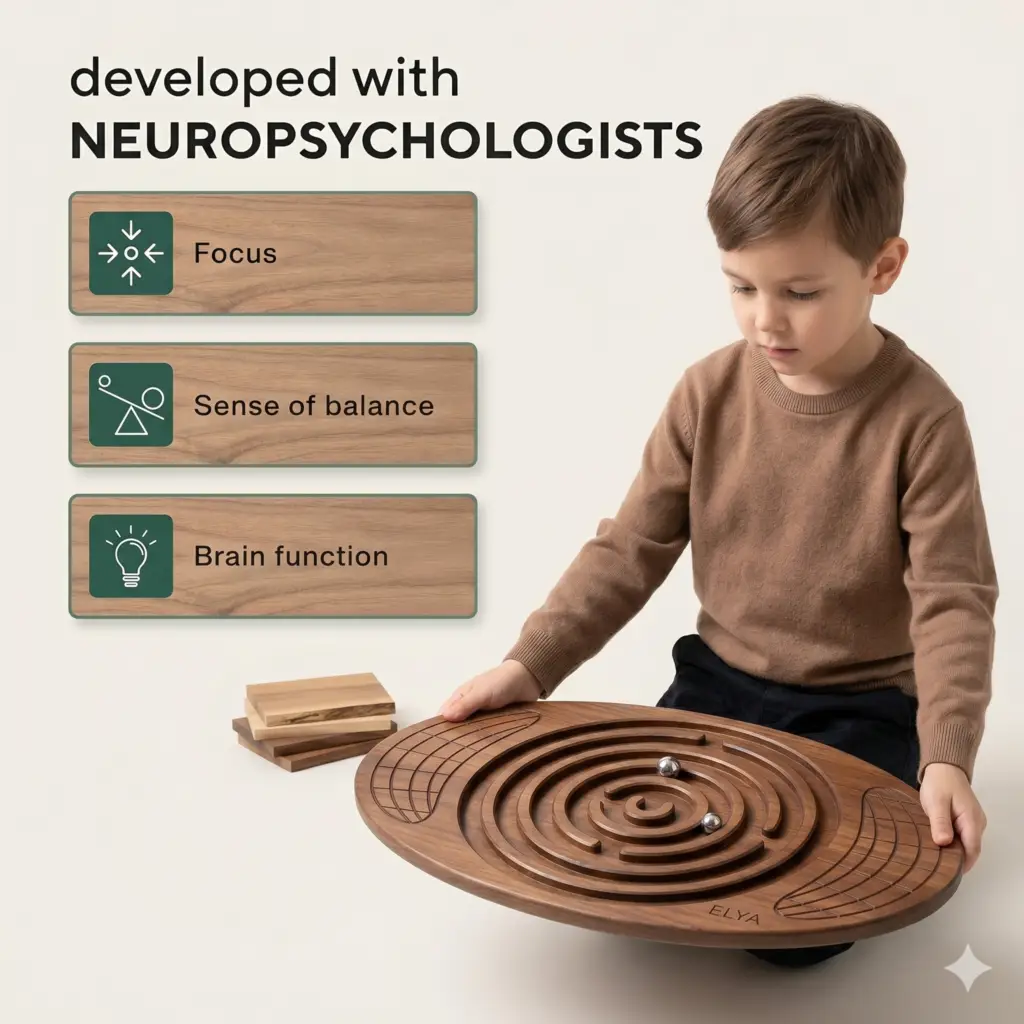 The Balance Board Maze is a beautifully crafted wooden board that turns movement into an engaging game